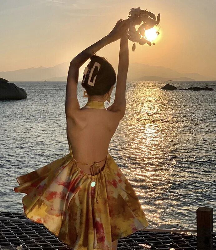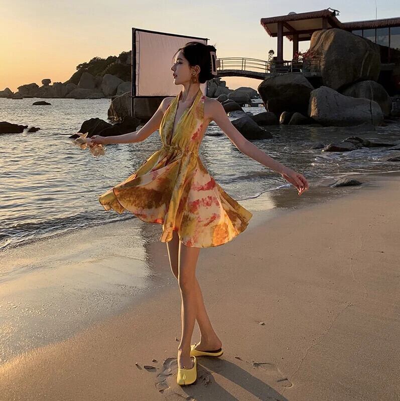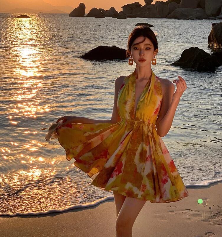 Pinkoz ホリデーシックビーチホルターイエローフローラルミニドレス背中開いたセクシーカジュアル若いショートノースリーブドレス ピンク 半袖 ハーフスリーブ 花柄
