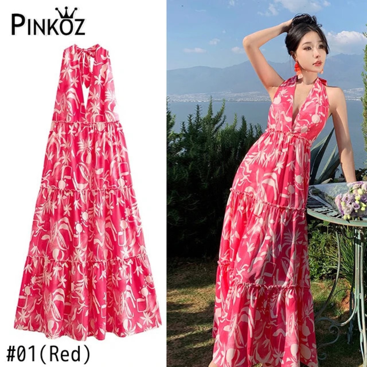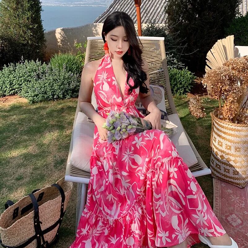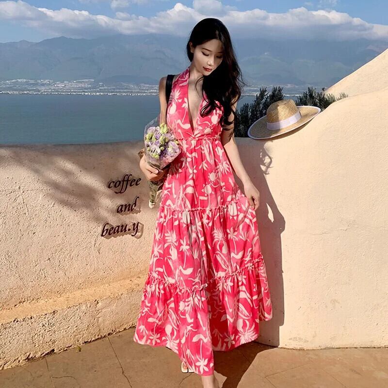 Pinkoz カジュアル赤花柄ミディドレス v ネックホルターノースリーブ自由奔放生きるドレス春夏ビーチ自由奔放生きる Vestidos ローブ ピンク レッド スプリング 春物 サマー 夏物 Vネック