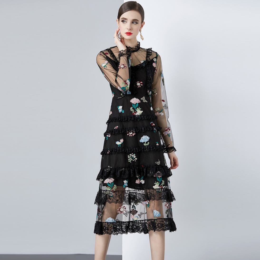 Pinkoz 滑走路デザイナーベージュ花刺繍 o ネック長袖ミディドレス高級ドレス Vestidos ロング ピンク Oネック フラワーデザイン