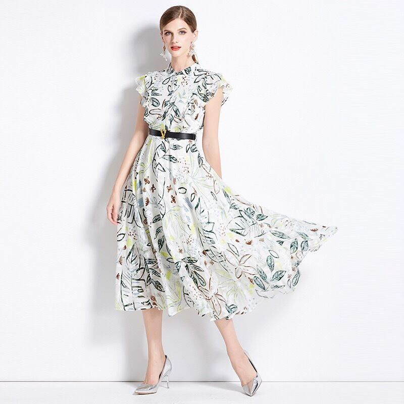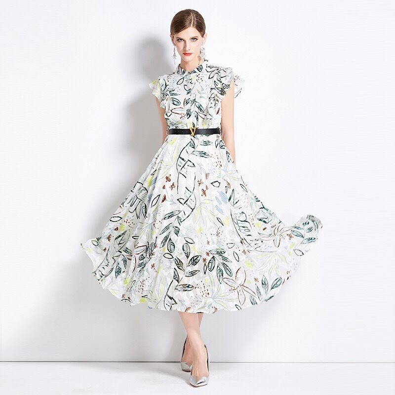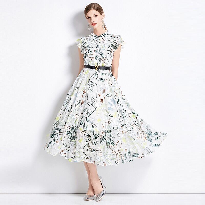 Pinkoz 滑走路デザイナーシングルフリル花柄ミディロングドレス春夏ヴィンテージ Vestidos ベルト付き ピンク ラッフル スプリング 春物 サマー 夏物 ハーネス ビンテージ