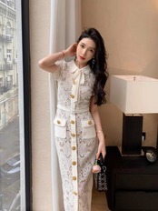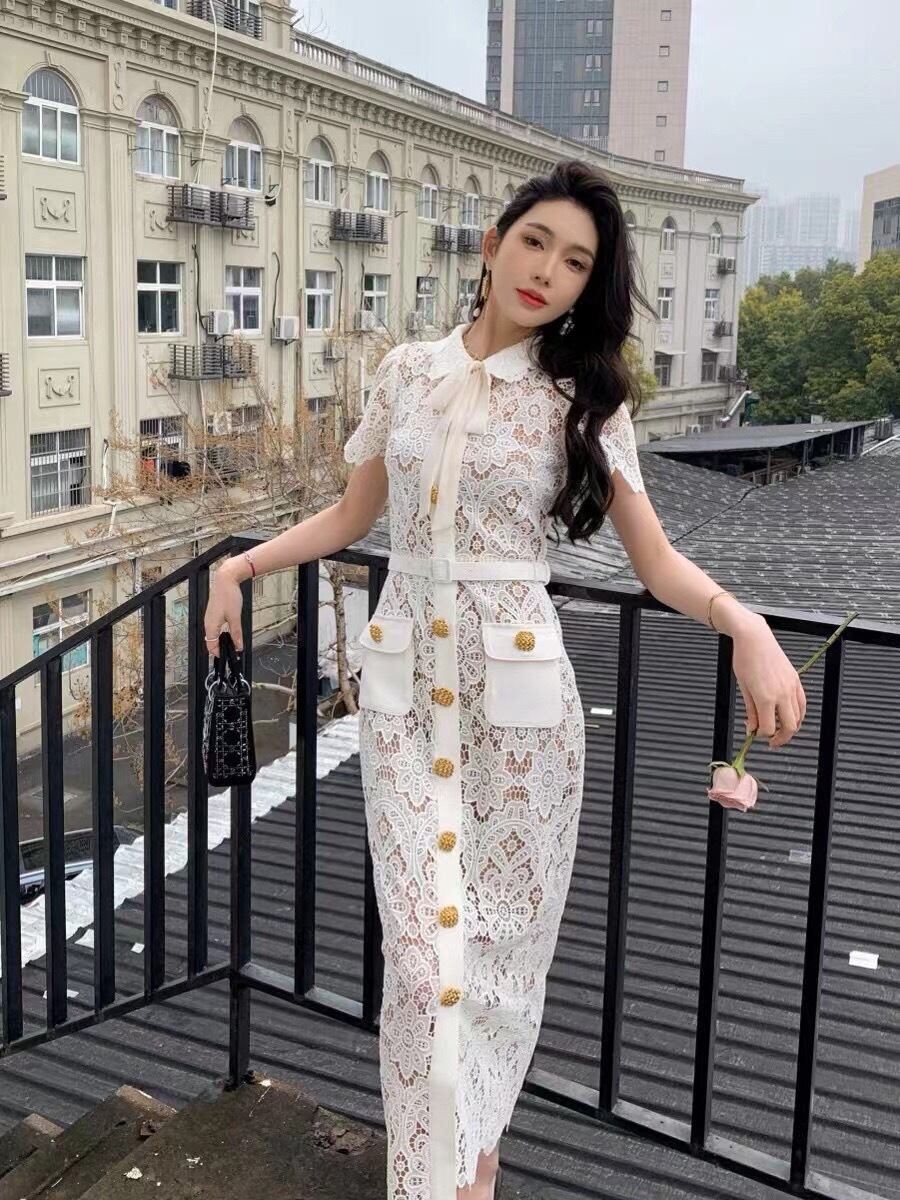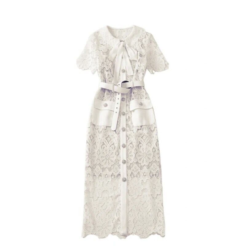 Pinkoz 滑走路デザイナーホワイトレースペンシルミディドレスターンダウン襟リボン半袖シングルブレストボタンパーティードレスローブ ショート ピンク ハーフスリーブ