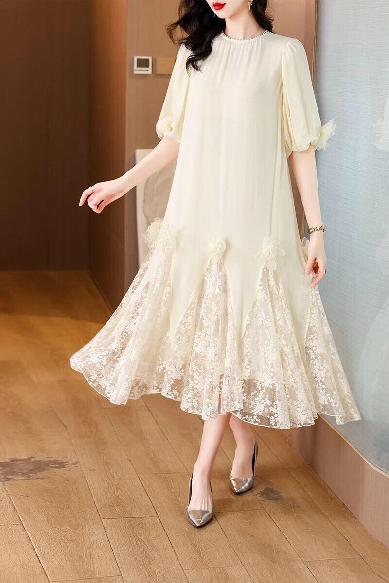 Pinkoz デザイナー o ネックパフスリーブピンクレースフラワーアップリケルースミディドレス春夏パーティービッグサイズ 3XL ベストローブ スプリング 春物 サマー 夏物 Oネック フラワーデザイン