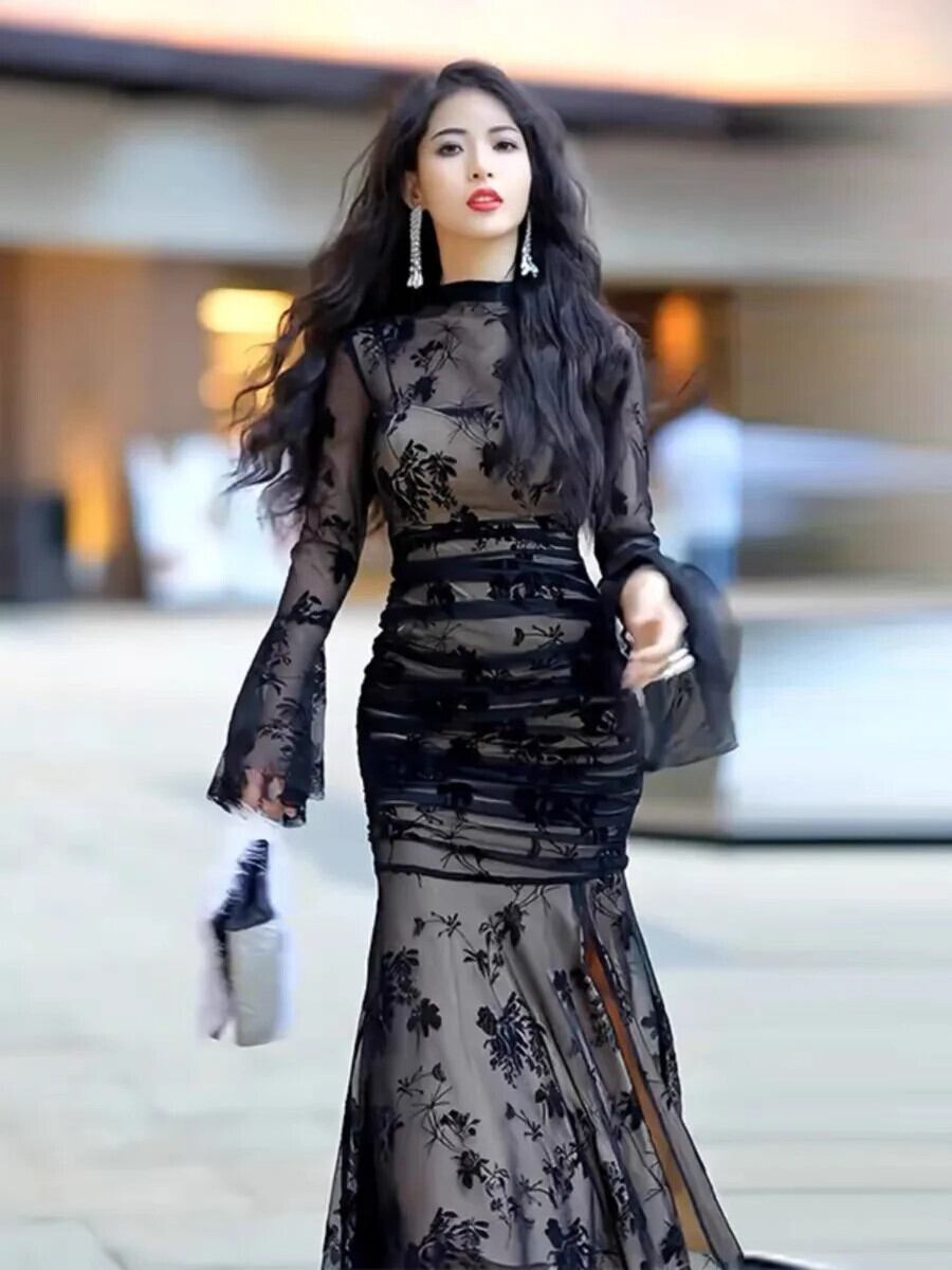 Pinkoz 滑走路デザイナー黒アウトレースぬるぬるマーメイドミディドレスフリルフレアスリーブパーティーナイトvestidosヴィンテージローブza ピンク ブラック ラッフル ビンテージ
