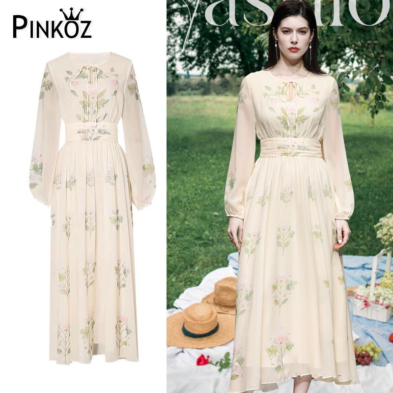 Pinkoz 滑走路デザイナースタイリッシュベージュ花柄 O ネックシフォンマキシ長袖エレガントヴィンテージ Vestidos ローブデムジェローブ ロング ピンク Oネック ビンテージ