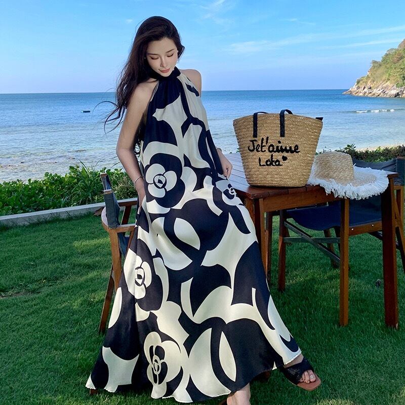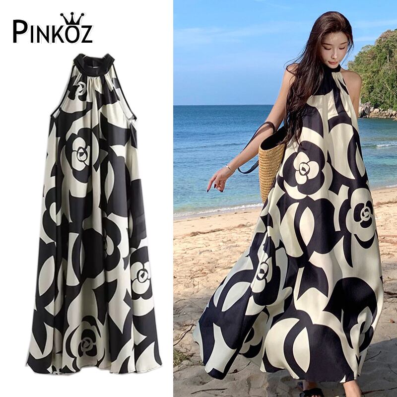 Pinkoz 休日夏シック黒バラ花柄プリントミディロングドレスルーズホルターノースリーブ Vestidos カジュアル za ピンク ブラック サマー 夏物 フラワーデザイン