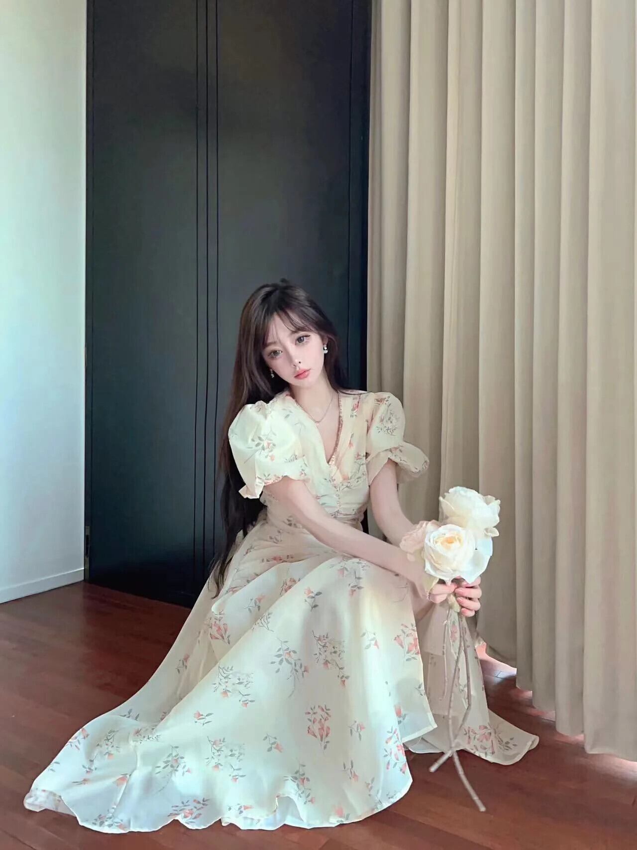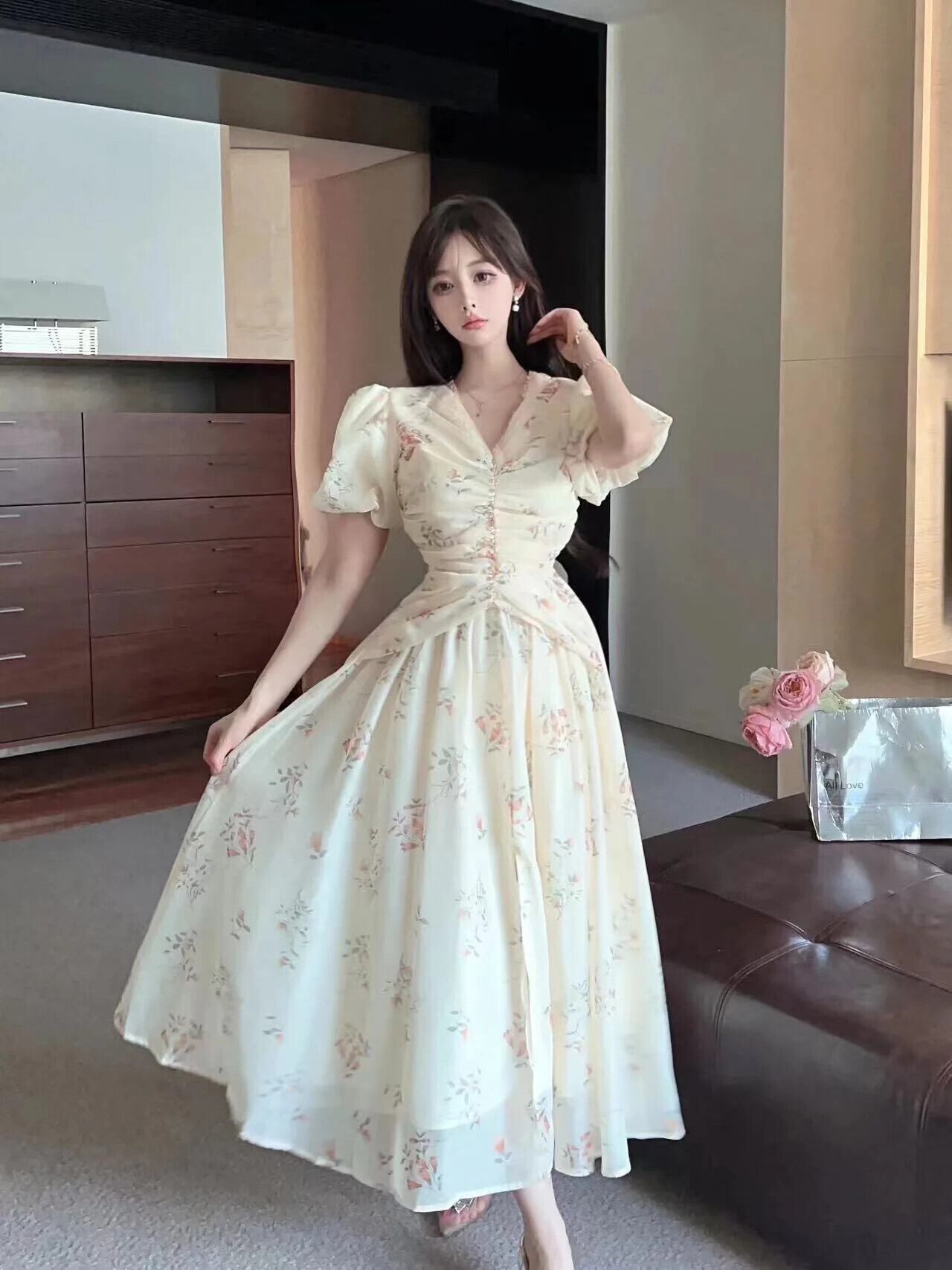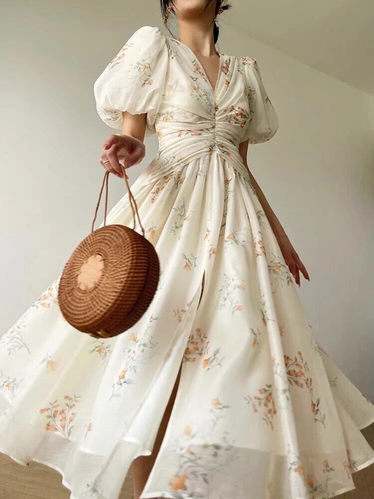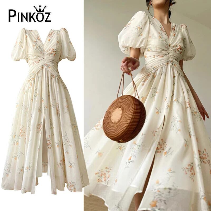 Pinkoz 滑走路デザイナーヴィンテージベージュ花柄 V ネックシフォンパーティードレスフレンチシック A ライン Vestidos ヴィンテージ ピンク Vネック Aライン ビンテージ