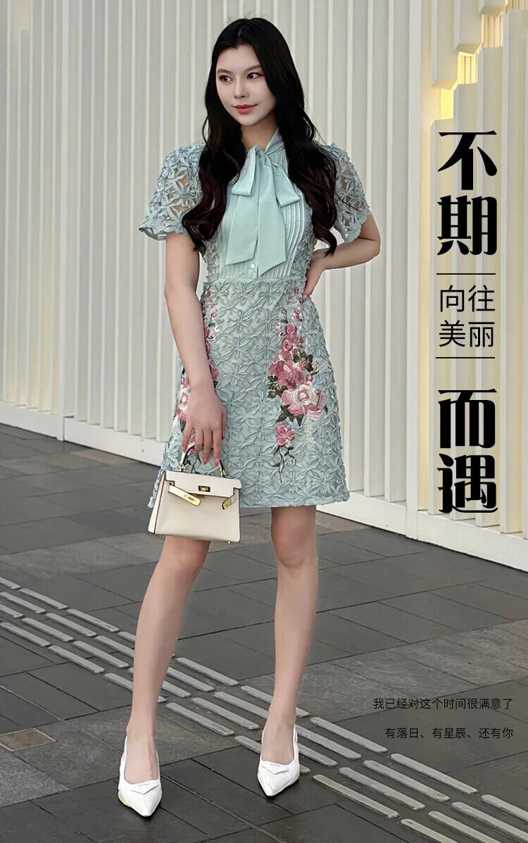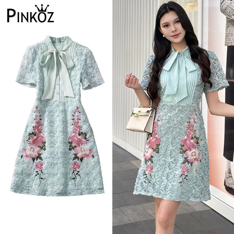 Pinkoz デザイナースタイリッシュライトブルーリボン襟半袖春夏花刺繍高級パーティーストレートドレスヴィンテージ ショート ピンク ハーフスリーブ スプリング 春物 サマー 夏物 フラワーデザイン ビンテージ