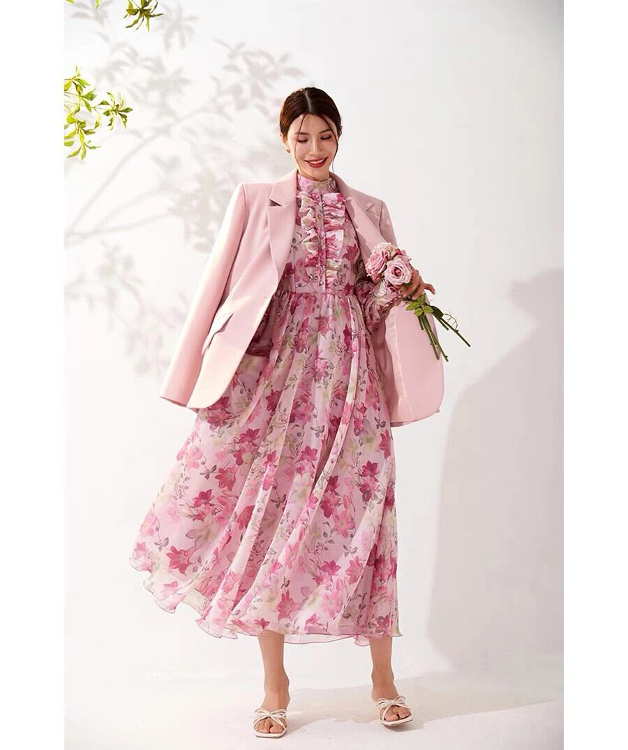 Pinkoz デザイナードレス花柄プリントミディドレス滑走路シャーリングフラワー A ラインボタンパーティーナイト Vestidos ヴィンテージ ピンク Aライン フラワーデザイン ビンテージ