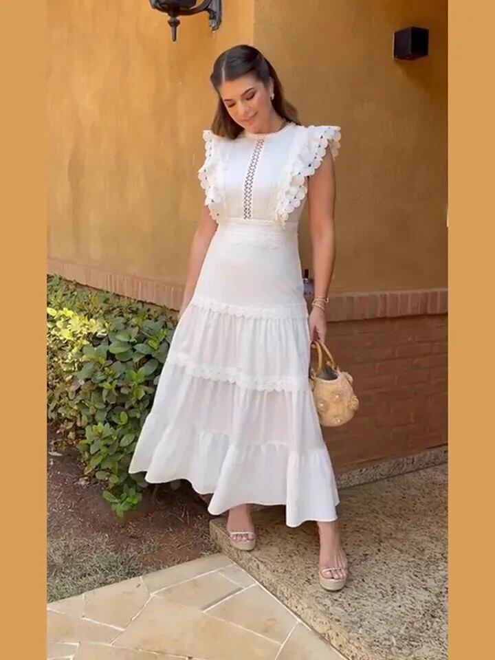 Pinkoz デザイナーファッション衣類パッチワークレース刺繍フリルノースリーブ O ネックパーティーイエロードレスローブ Vestidos ピンク ラッフル Oネック