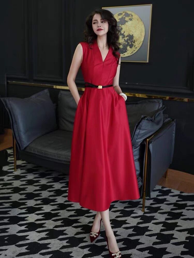 Pinkoz レッドベージュ V ネックノースリーブミディ A ラインドレスエレガント作業 OL ドレスベルト付き Vestidos ローブ ピンク ハーネス Vネック Aライン