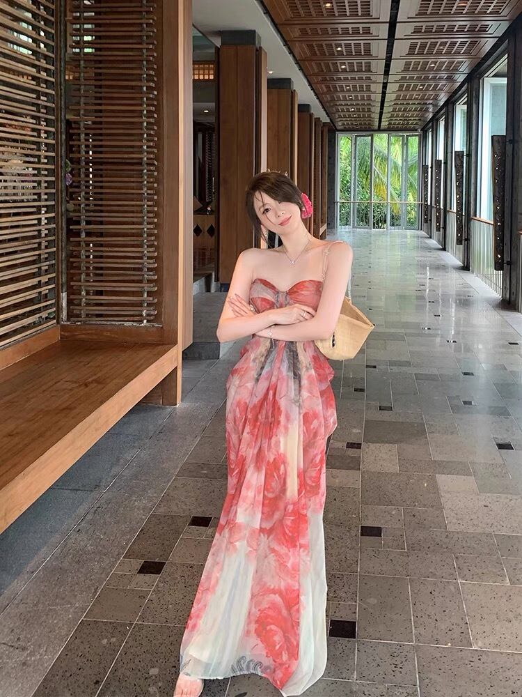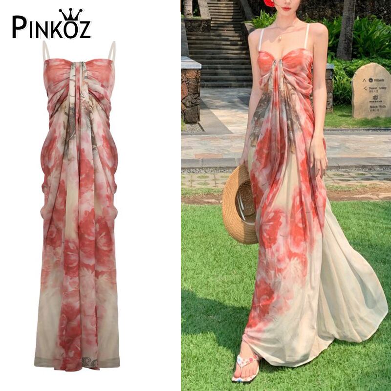 Pinkoz 滑走路デザイナーマキシスパゲッティストラップメッシュ花柄プリントぬるぬるドレスぬるぬるパーティーナイトディナーvestidosヴィンテージ ピンク ビンテージ