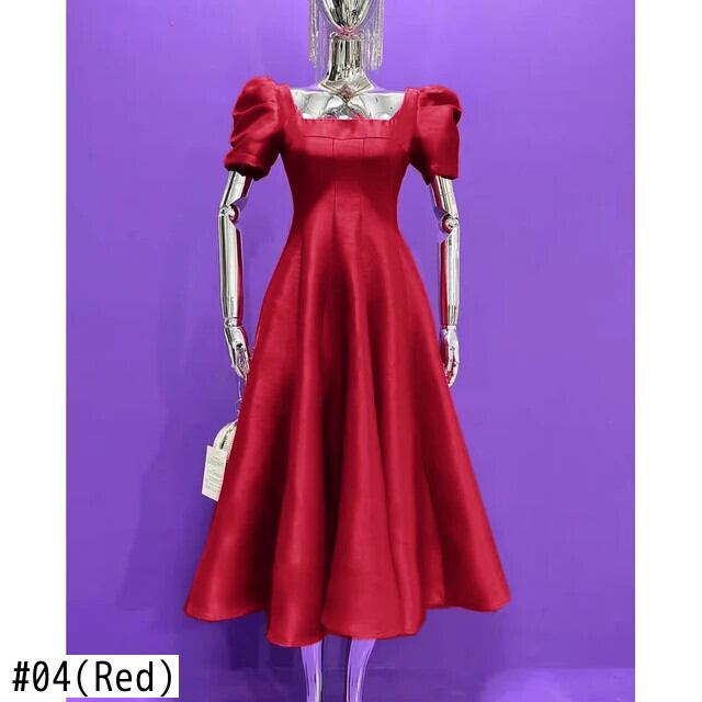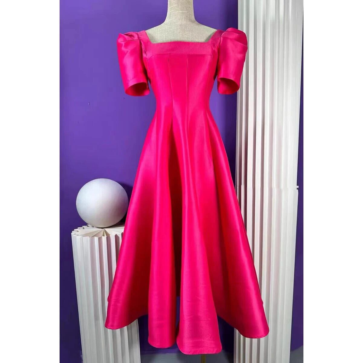 Pinkoz 滑走路デザイナーフクシアスクエアカラーパフスリーブ半袖パーティーエレガントディナー A ラインドレス Vestidos ローブ ショート ピンク ハーフスリーブ Aライン スクウェア
