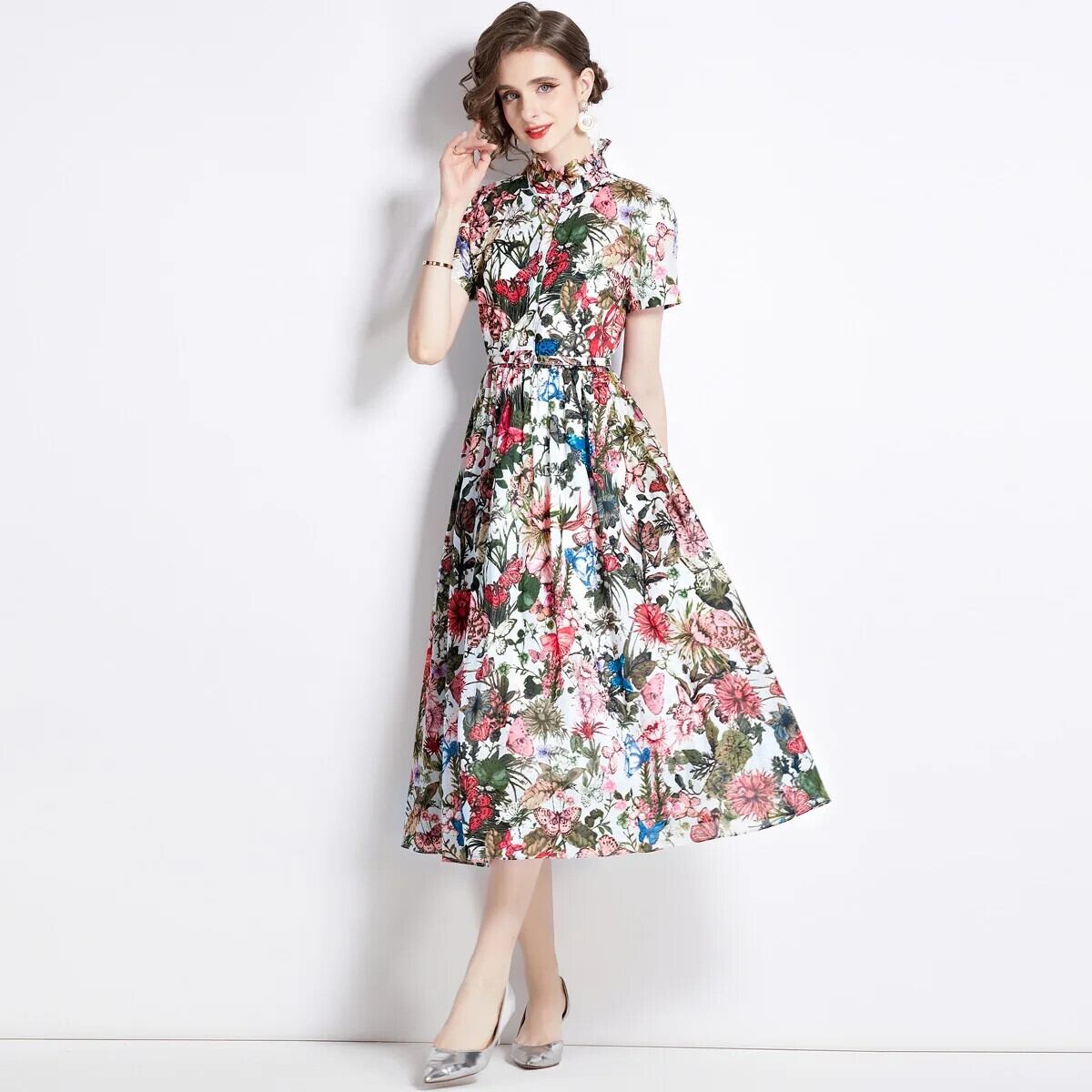 Pinkoz スタイリッシュセレブミディシングルブレストスタンドカラーシャーリング半袖夏カジュアルエレガントドレスベルト付き Vestidos ショート ピンク ハーフスリーブ サマー 夏物 ハーネス