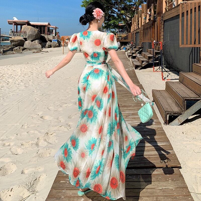 Pinkoz デザイナー花柄 V ネックパフスリーブ春夏 A ラインシフォンパーティーホリデードレスベルトレースアップローブ ピンク スプリング 春物 サマー 夏物 ハーネス Vネック Aライン