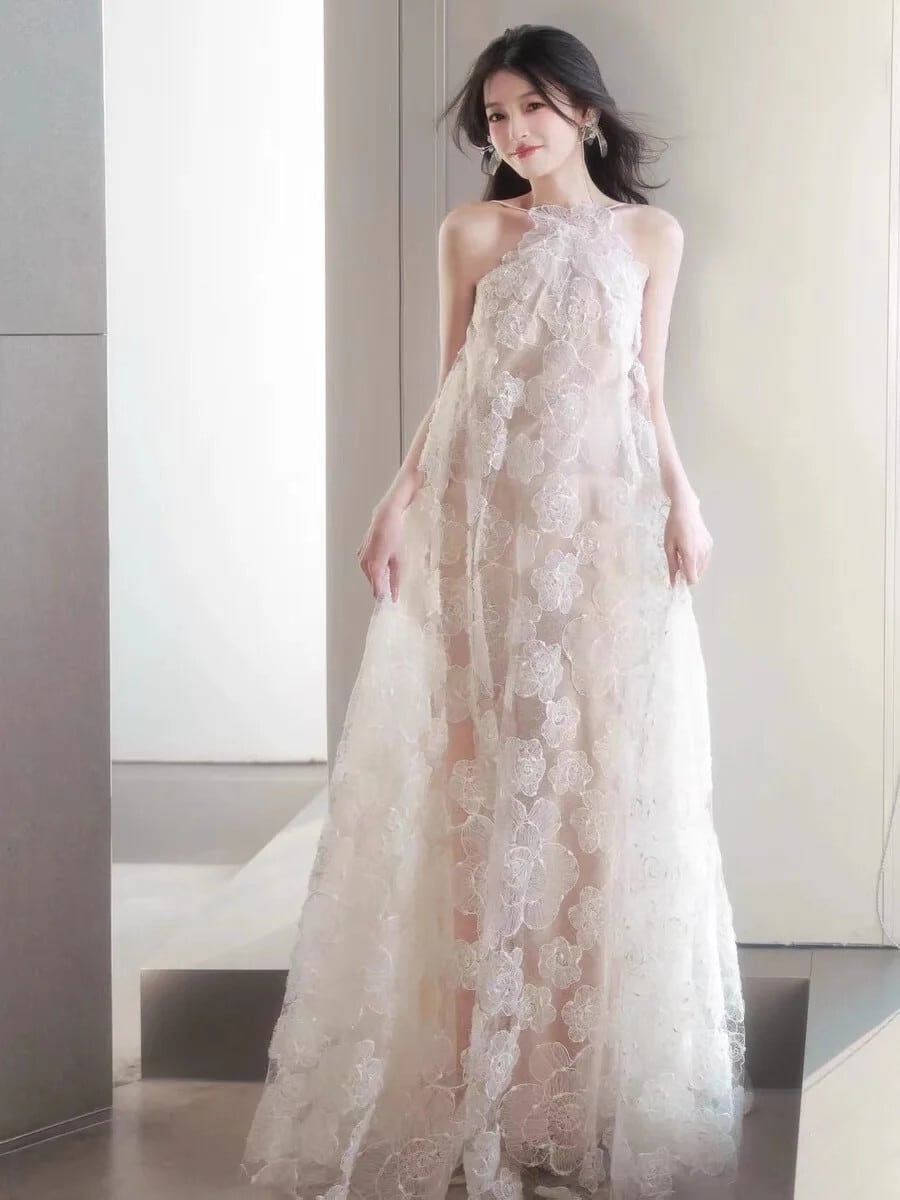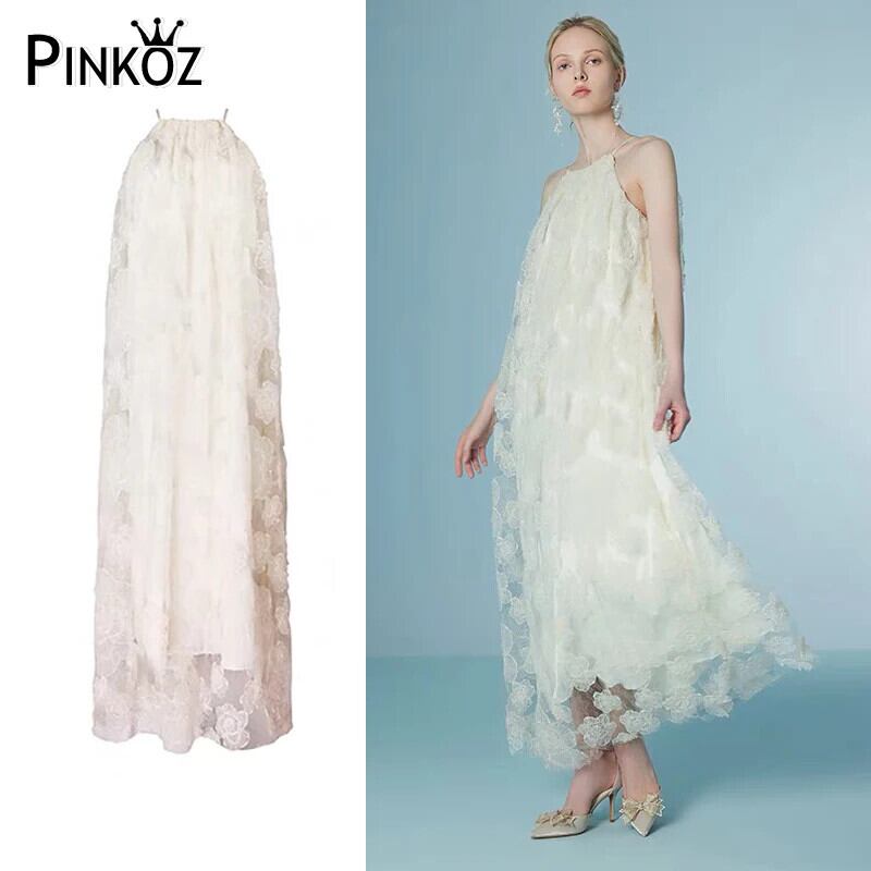 Pinkoz デザイナー白い花レースルース春夏マキシロングドレスホルターノースリーブパーティーホリデードレスvestidos ピンク ホワイト スプリング 春物 サマー 夏物 フラワーデザイン