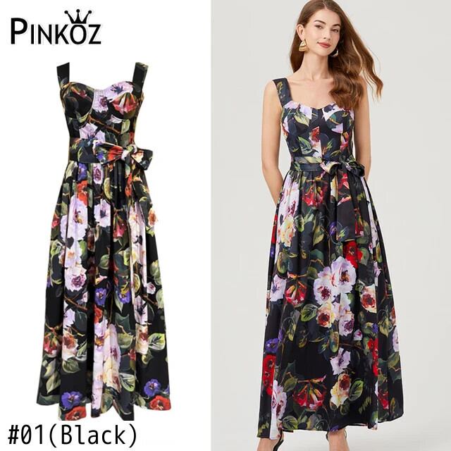 Pinkoz 滑走路デザイナースパゲッティストラップマキシ花柄 A ラインホリデーシックカジュアルレースアップサッシロングドレス Vestidos ローブ ピンク Aライン