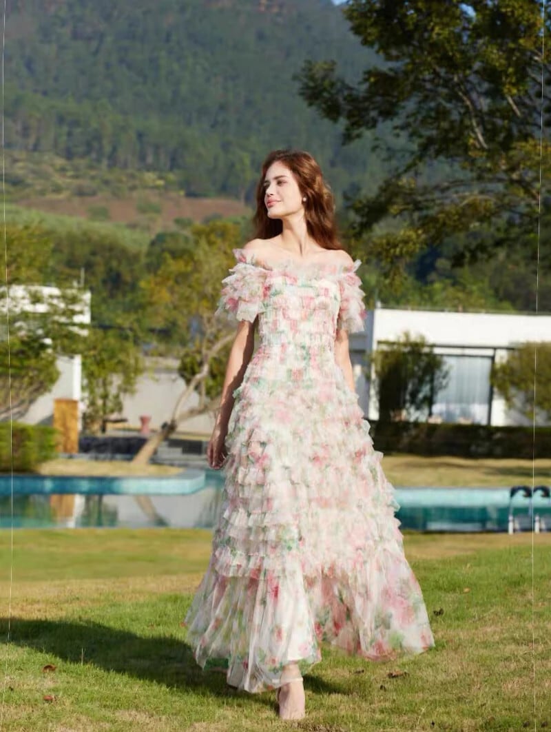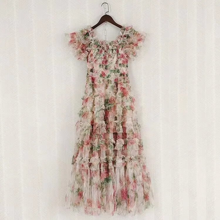 Pinkoz 滑走路デザイナースタイリッシュ黒シャーリングスラッシュネックカスケードレイヤードフリルミディドレス花柄ドレスヴィンテージ ピンク レッド ブラック ラッフル ビンテージ