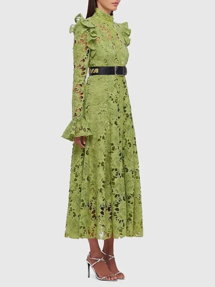 Pinkoz デザイナースタンドカラーフレアスリーブレースミディドレスベルト付きエレガントアウトパーティーナイトドレスフィーム ピンク ハーネス