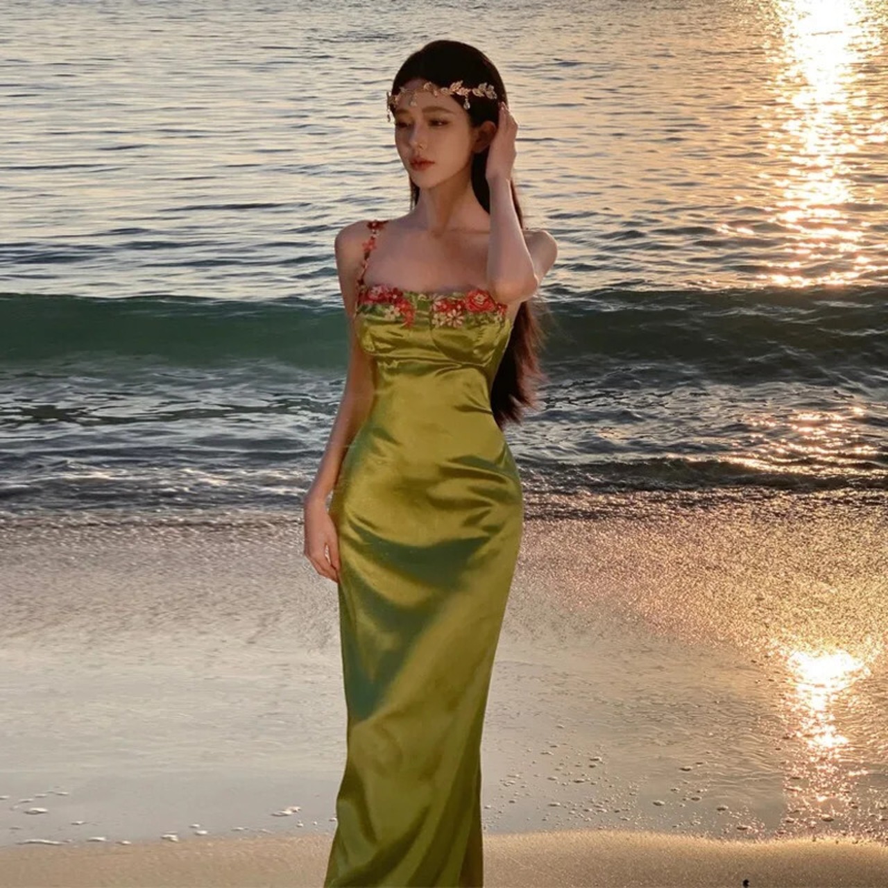 Pinkoz 滑走路デザイナー緑赤花アップリケスパゲッティストラップぬるぬるパーティーナイトドレスファムファッションハイストリート ピンク レッド フェミニン グリーン フラワーデザイン