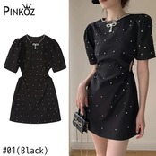 Pinkoz 滑走路デザイナー黒白クリスタル水玉ミニドレス o ネックアウトリボンドレスパーティー誕生日vestidos ヴィンテージ ピンク ホワイト ブラック Oネック ビンテージ