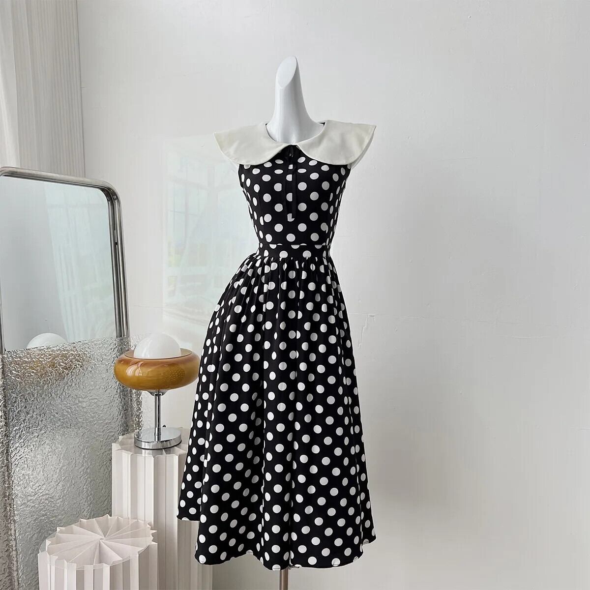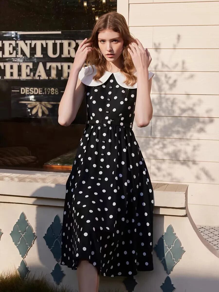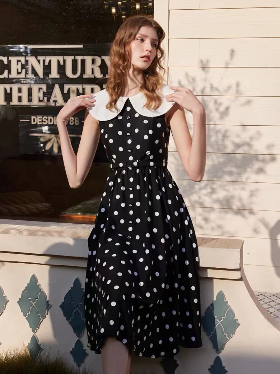 Pinkoz ヴィンテージエレガントフレンチシックミディドレスピーターパン襟 A ラインレースアップハイウエストポルカドット Vestidos ローブデ ハイウェスト ピンク Aライン ビンテージ
