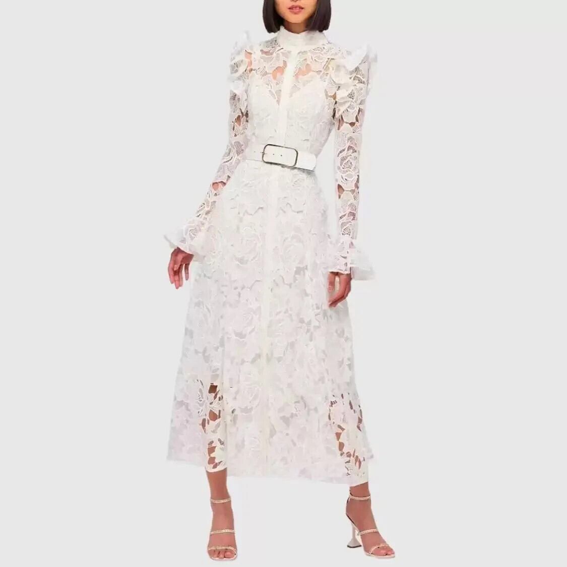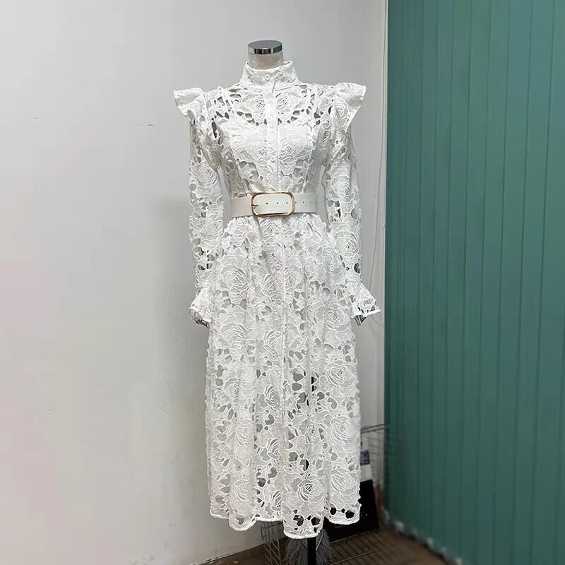 Pinkoz 滑走路デザイナーファッショングリーンレースフレアスリーブアウトパーティーディナードレスベルト付きvestidos ピンク ハーネス