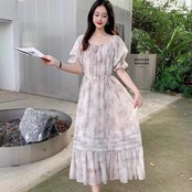 Pinkoz ヴィンテージエレガント O ネックパフスリーブルーズレースアップミディドレスホリデーパーティーカジュアルドレスシックファッション Vestidos ローブ ピンク Oネック ビンテージ