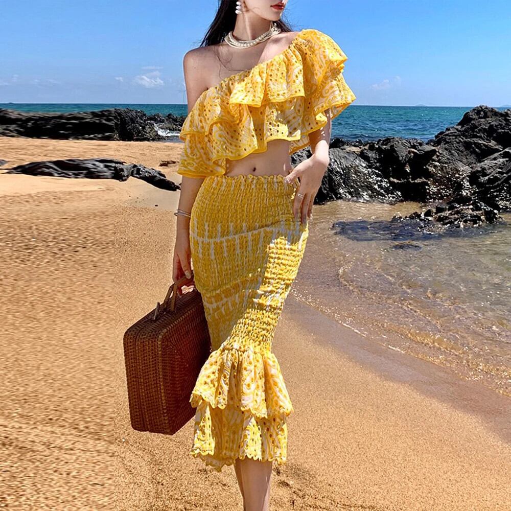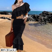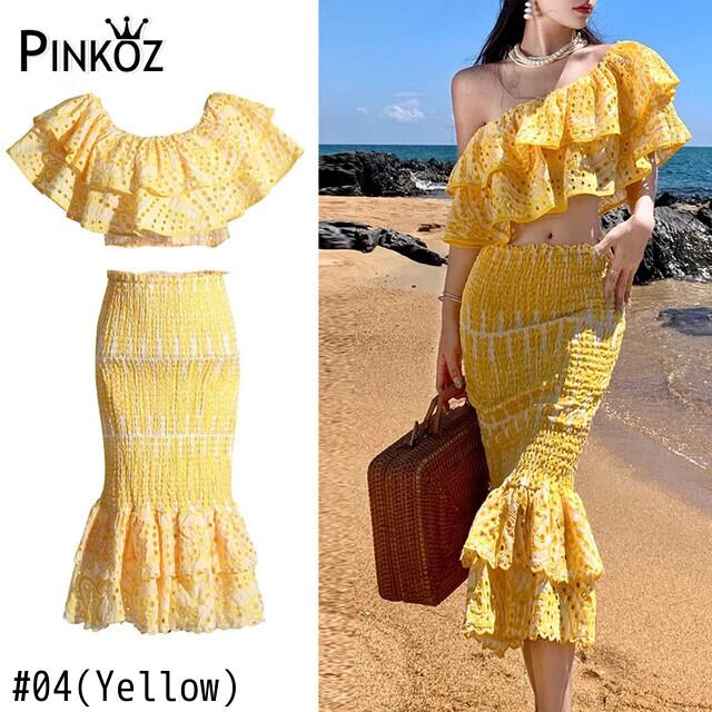 Pinkoz 滑走路デザイナー 2 枚セット刺繍アウトレースフリルショートトップスミディぬるぬるスカートスーツ ピンク ラッフル