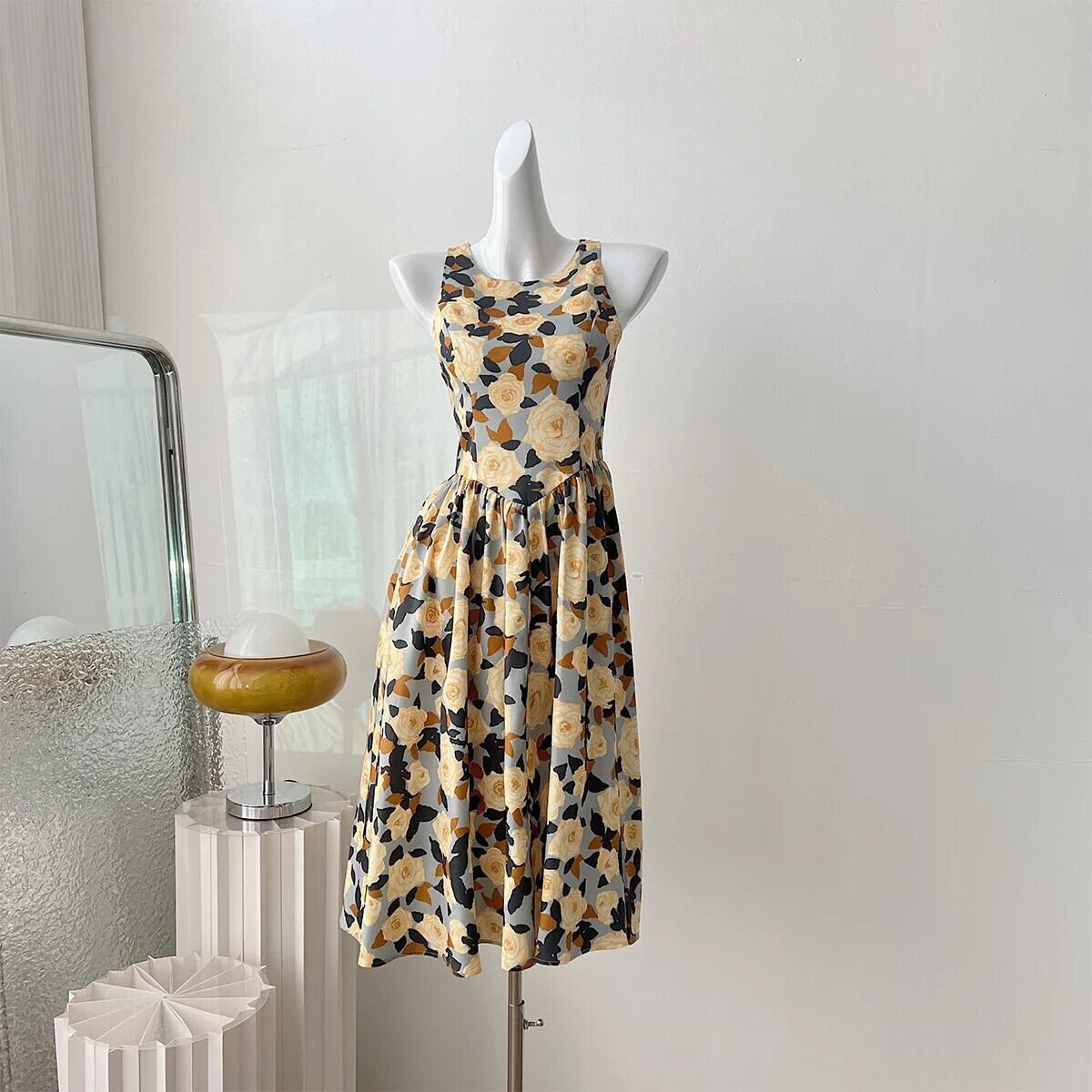 Pinkoz 滑走路デザイナー黄色花柄ノースリーブミディドレス背中開いたハイトウエスト春夏ヴィンテージ Vestidos ローブデ ピンク スプリング 春物 サマー 夏物 ビンテージ