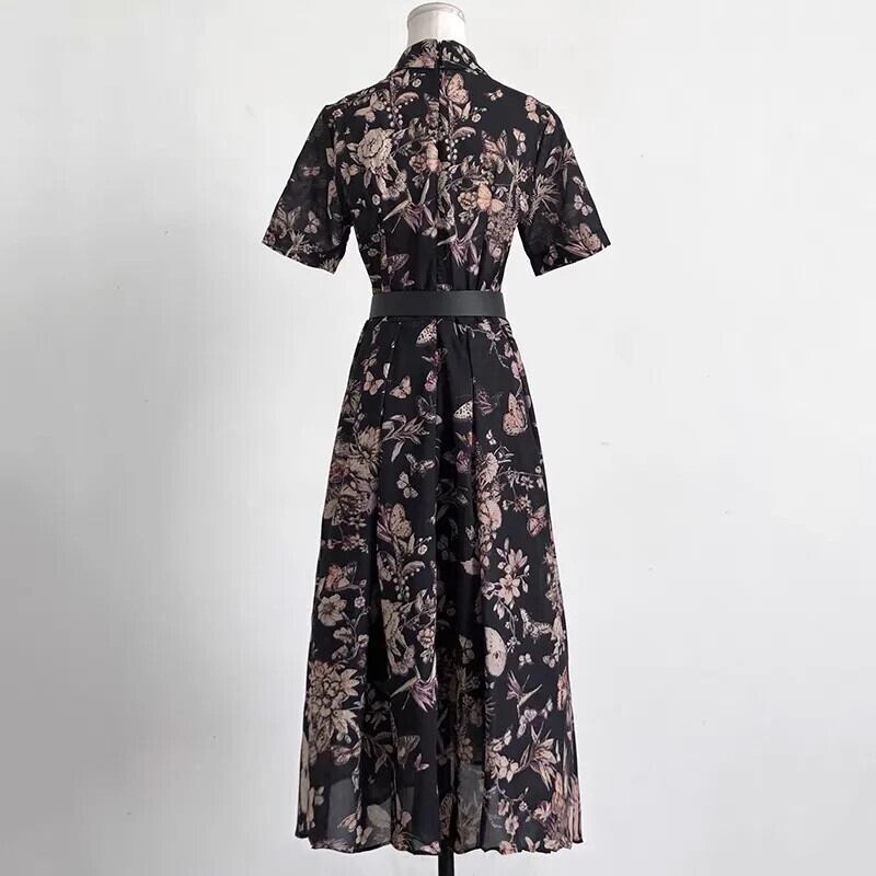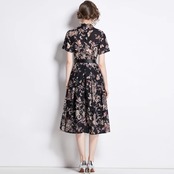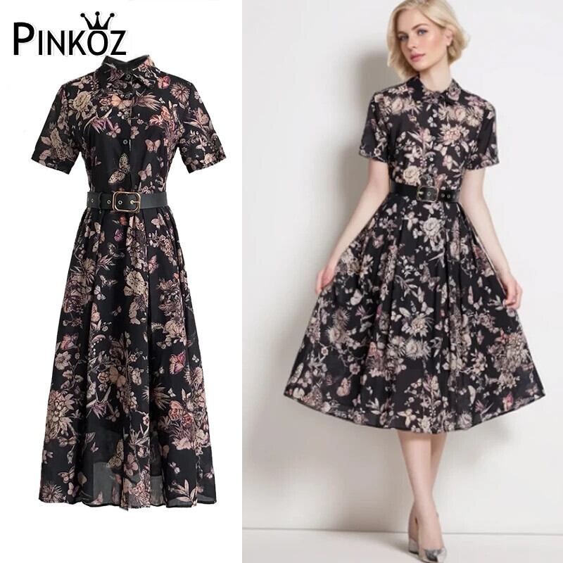 Pinkoz デザイナー春夏花柄プリントターンダウン襟シングルブレストミディドレスベルト付きvestidosローブ ピンク スプリング 春物 サマー 夏物 ハーネス