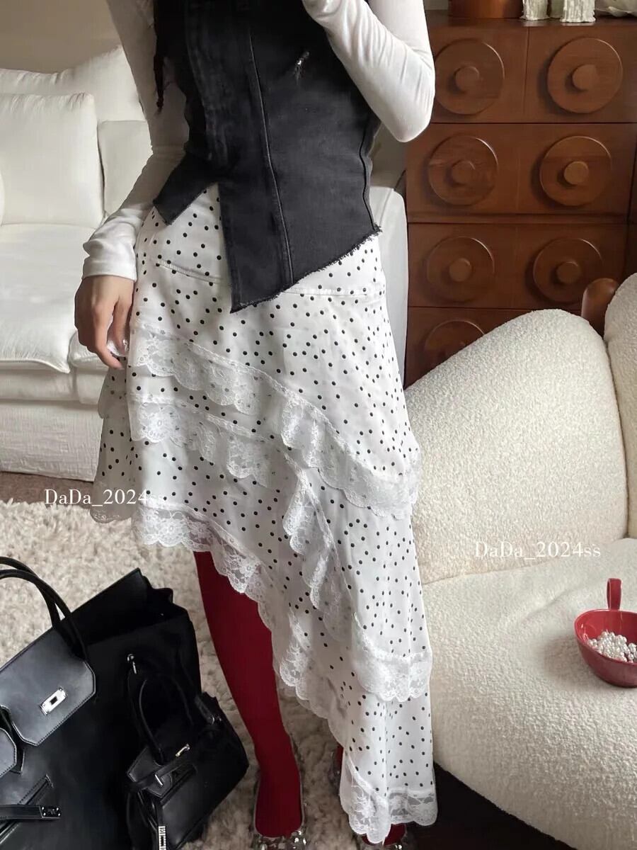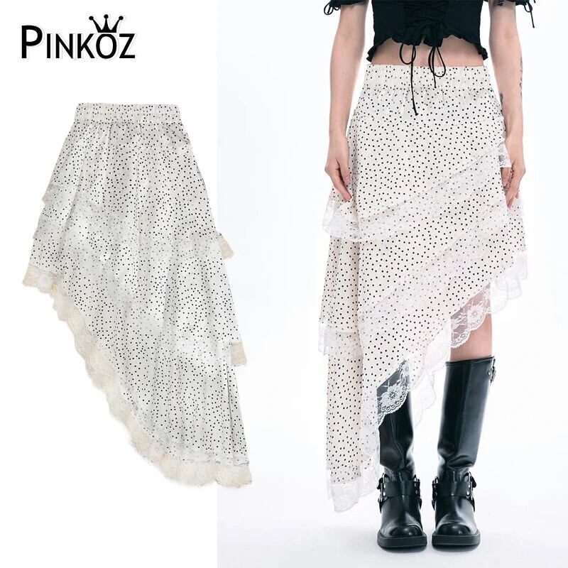Pinkoz デザイナーポルカ dpt パッチワークレース不規則ミディスカート弾性ウエストハイファッションストリートスカートファムヴィンテージ ピンク エラスティック 伸縮 フェミニン ビンテージ