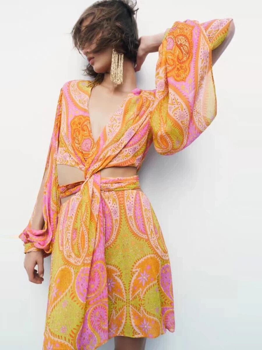 Pinkoz ランウェイデザイナー V ネックランタンスリーブ花柄シフォンミニドレスアウトビーチホリデー Vestidos ローブデムジェ ピンク Vネック