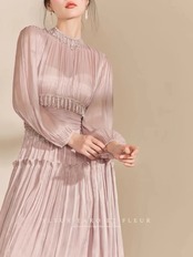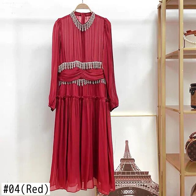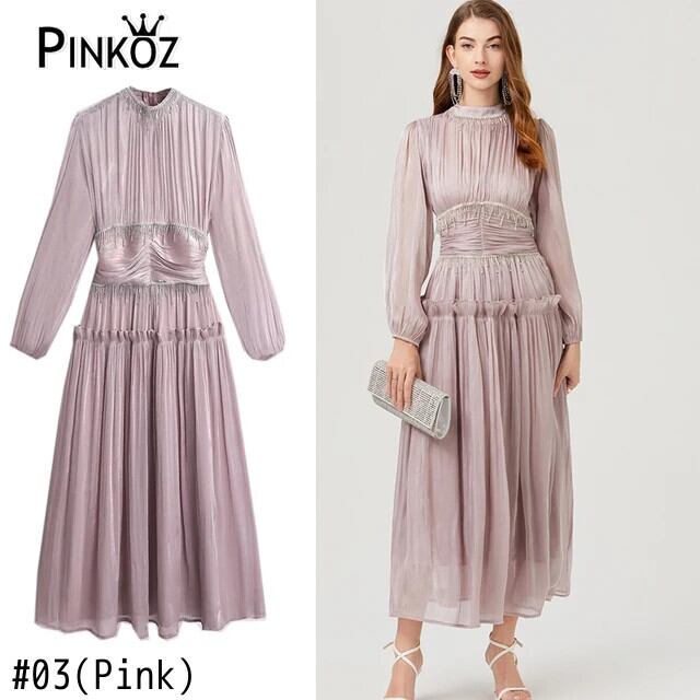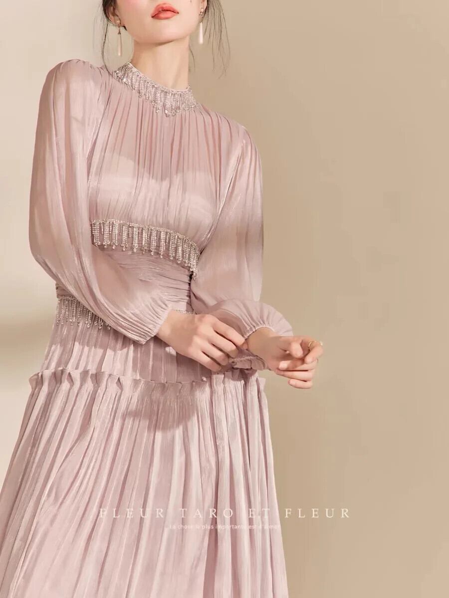 Pinkoz フレンチスタイリッシュマキシドレスクリスタルテルシフォンピンクランタンスリーブ O ネックダイヤモンドパーティーエレガント Vestidos Oネック