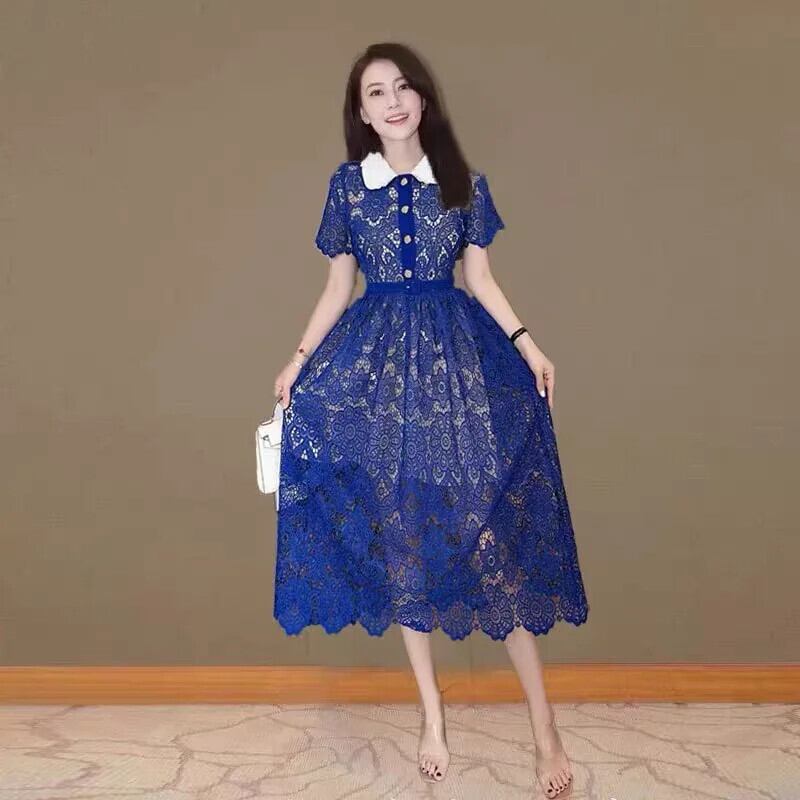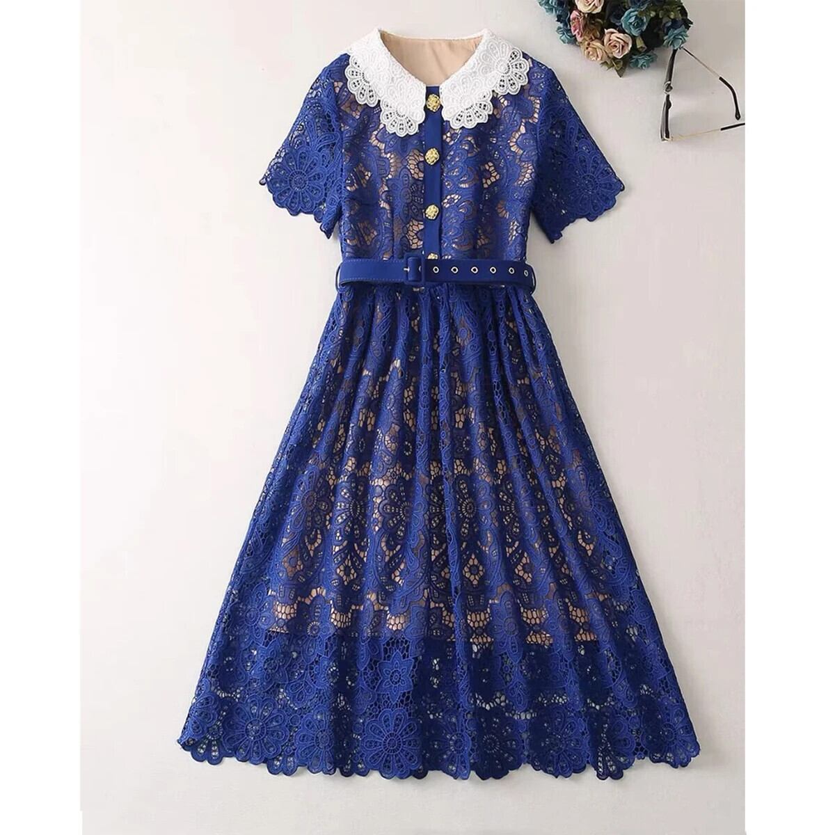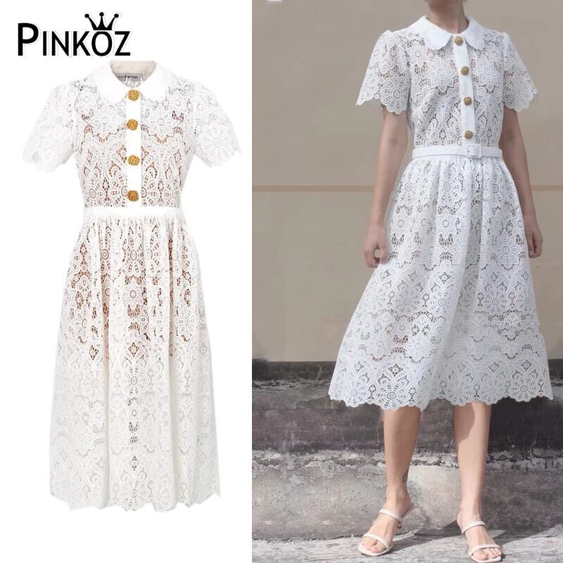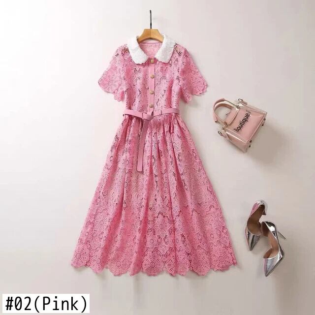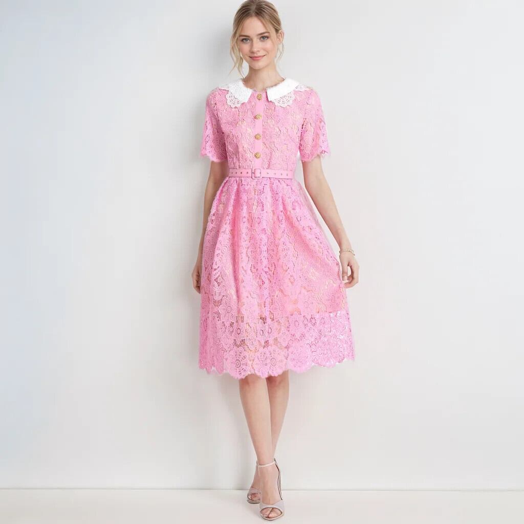 Pinkoz デザイナースタイリッシュホワイトレース膝丈ドレスペイターパン襟ヴィンテージシングルブレストボタン A ラインアウトベスト ピンク Aライン ビンテージ