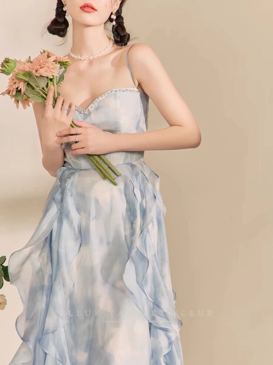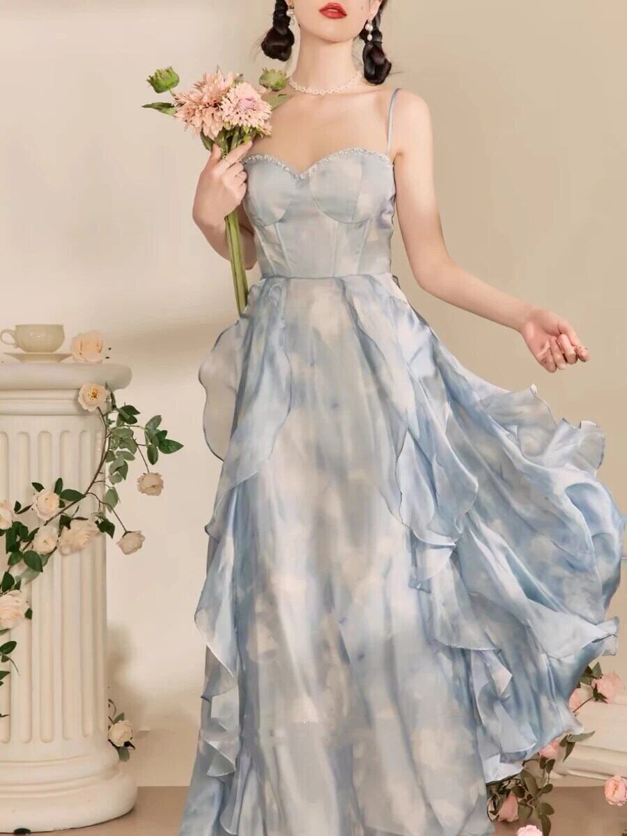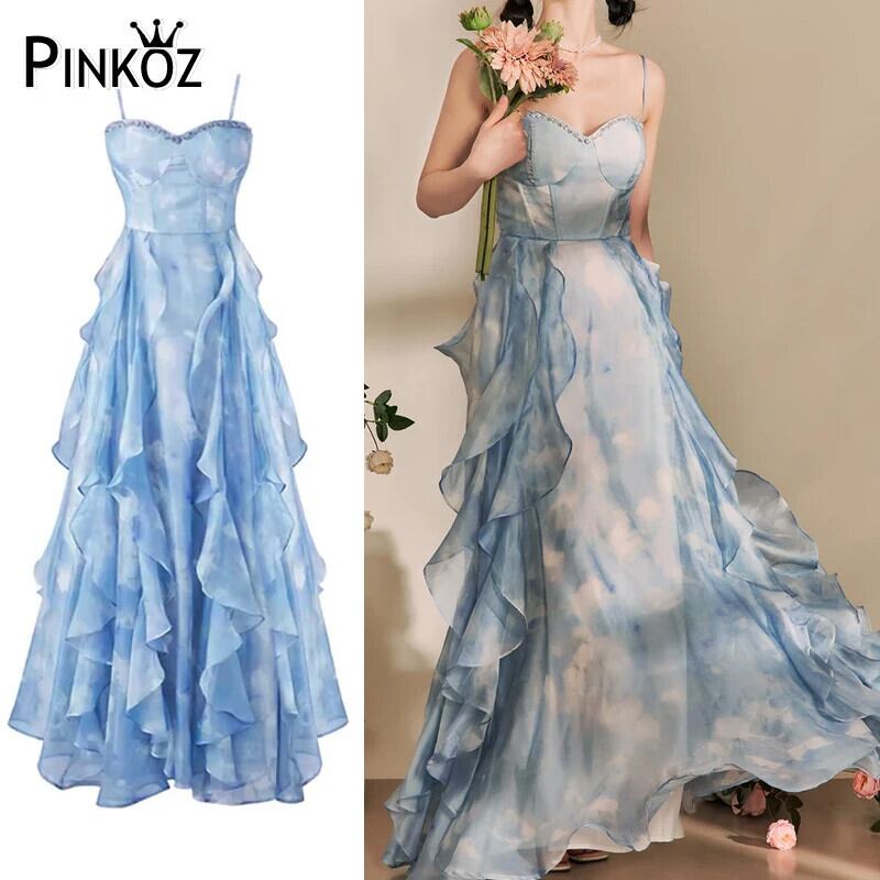 Pinkoz 夏ライトブルー花柄マキシドレスフリルスパゲッティストラップキャミソールホリデーパーティーvestidos自由奔放生きるドレス ピンク ラッフル サマー 夏物