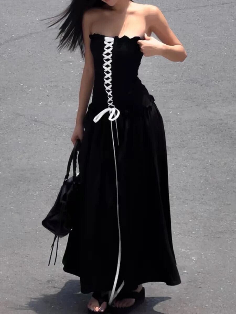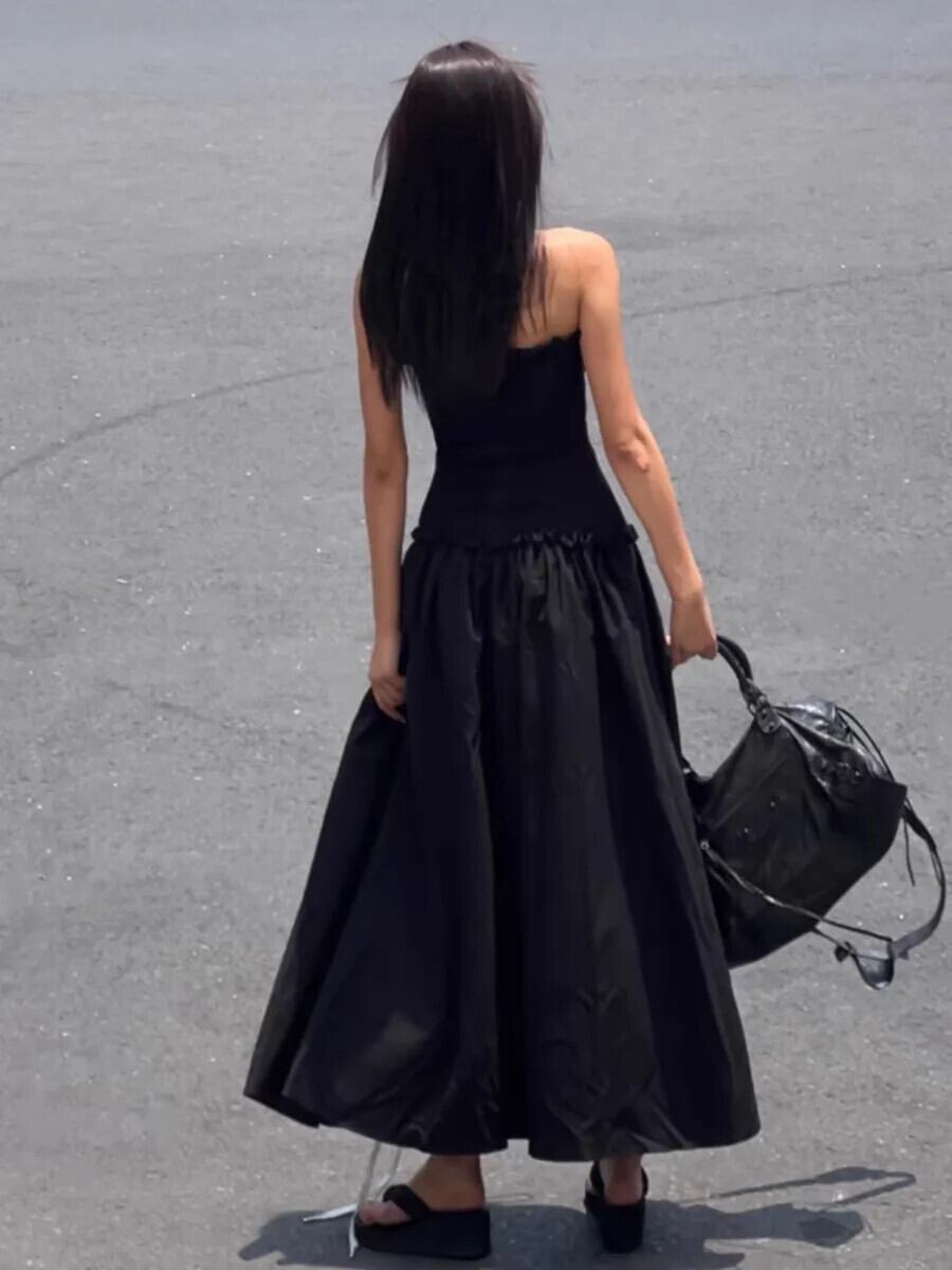 Pinkoz 滑走路デザイナー黒ゴシックミディぬるぬる弾性ストラップレスドレスストリング A ラインパーティーナイトドレス Vestidos ピンク ブラック エラスティック 伸縮 Aライン