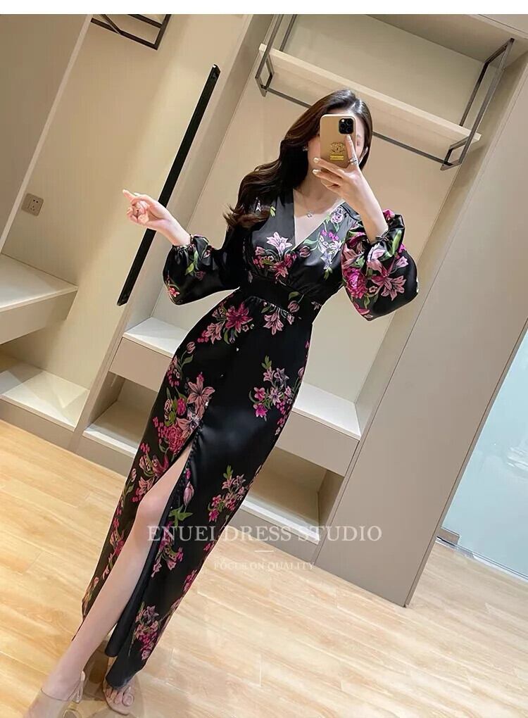 Pinkoz エレガント花柄 v ネックシングルブレストミディドレス長袖花自由奔放生きるファッションペンシルドレスvestidos ロング ピンク Vネック フラワーデザイン