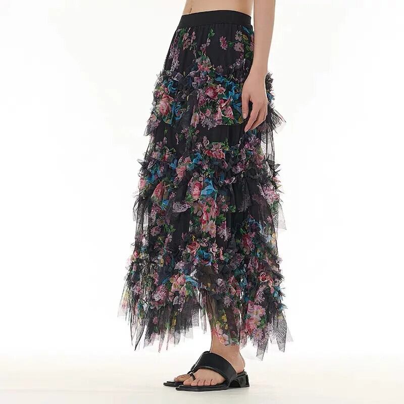 Pinkoz 滑走路デザイナー黒花柄シャーリング弾性ウエストマキシスカートパーティーメッシュ高級フェスティバル faldas ヴィンテージ ピンク ブラック エラスティック 伸縮 ビンテージ