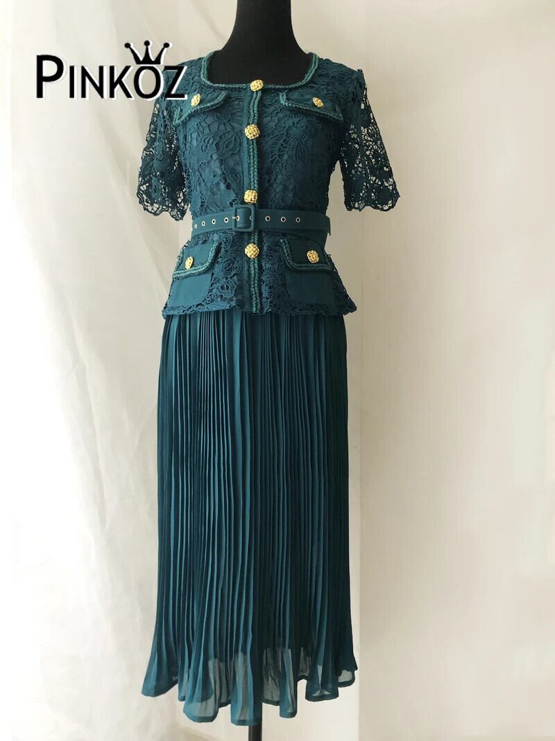 Pinkoz デザイナーシックダークグリーンボタン高級スクエアカラーサマーパーティーミディドレスパッチワークプリーツドレスベルト付き ピンク 夏物 ハーネス スクウェア