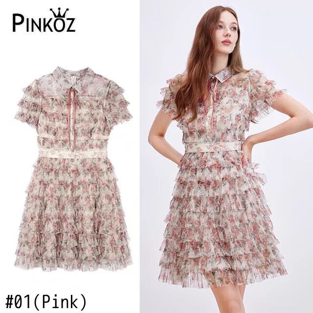 Pinkoz エレガントターンダウンカラー半袖弓ボタンミニドレス A ラインシャーリング花柄スタイリッシュ A ライン Vestidos ショート ピンク リボン ハーフスリーブ Aライン