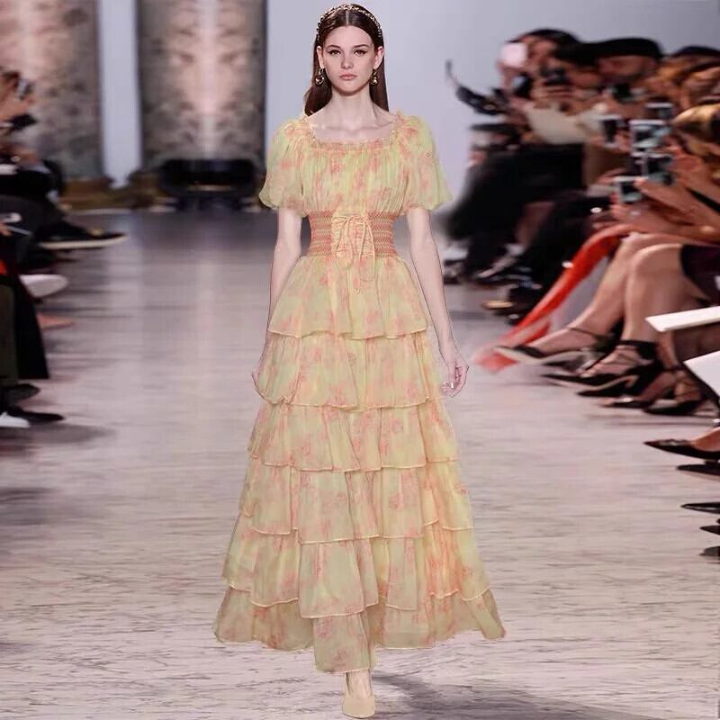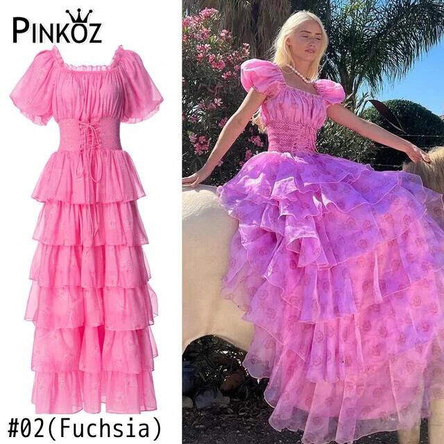 Pinkoz 滑走路デザイナー誕生日パーティーナイトマキシドレススクエアカラー花柄レイヤードレースアップフリルロングヴィンテージベスト ピンク レッド ラッフル スクウェア ビンテージ