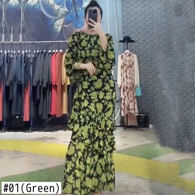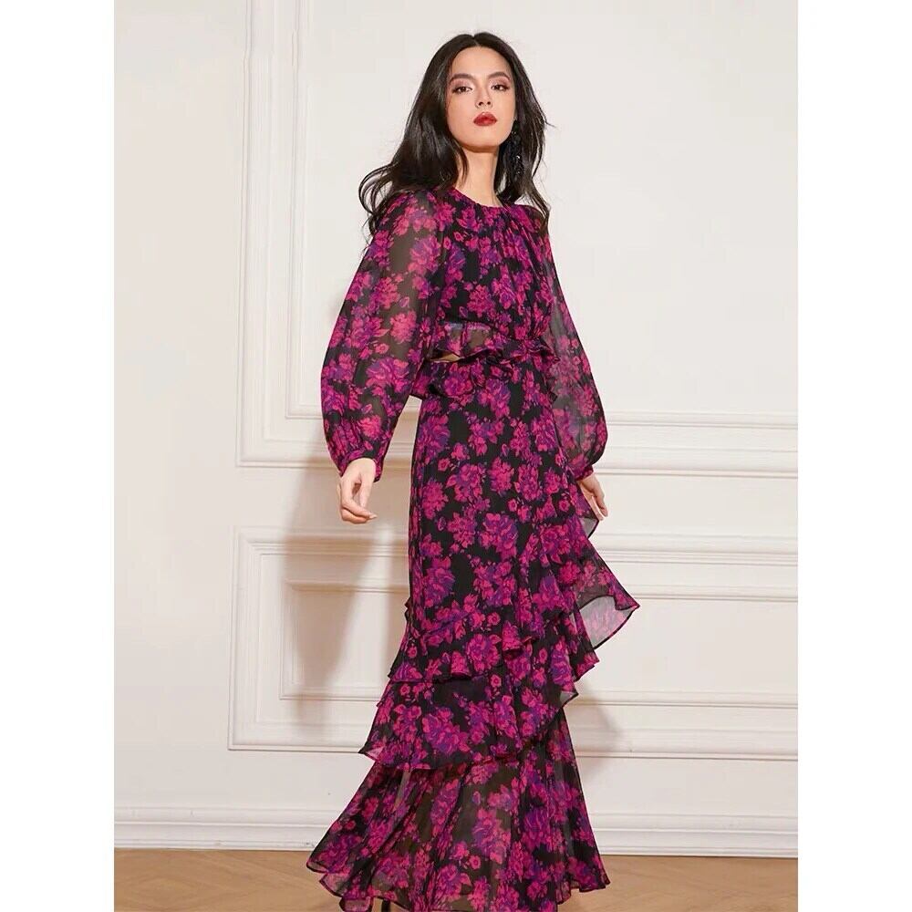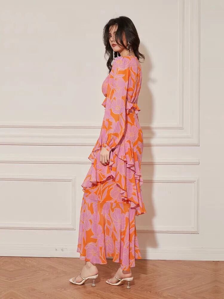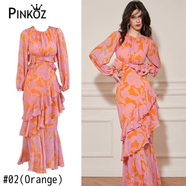 Pinkoz 滑走路デザイナーオレンジ花柄フリルアウトマーメイドマキシドレスシフォンパーティーナイトドレスローブ ピンク ラッフル