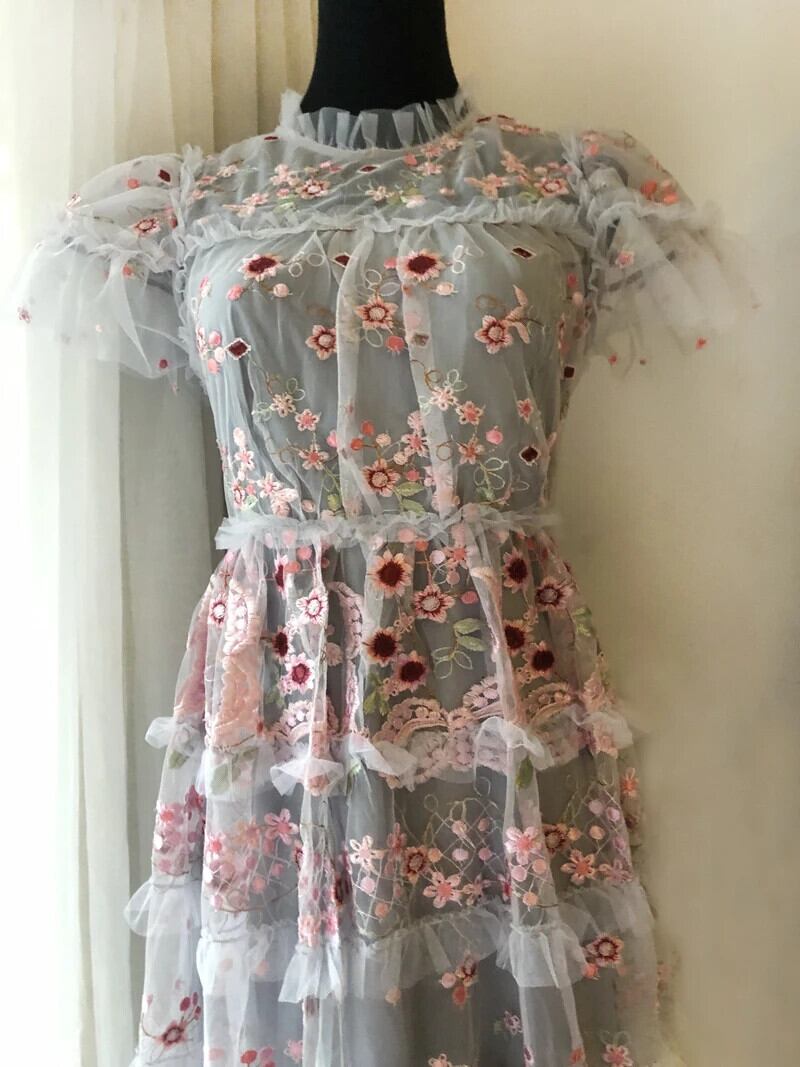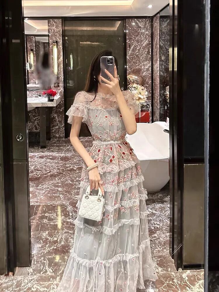 Pinkoz 滑走路デザイナーフラワー刺繍パッチワークメッシュ半袖カスケードレイヤードエレガントパーティードレス Vestidos ヴィンテージ ショート ピンク レッド ハーフスリーブ フラワーデザイン ビンテージ