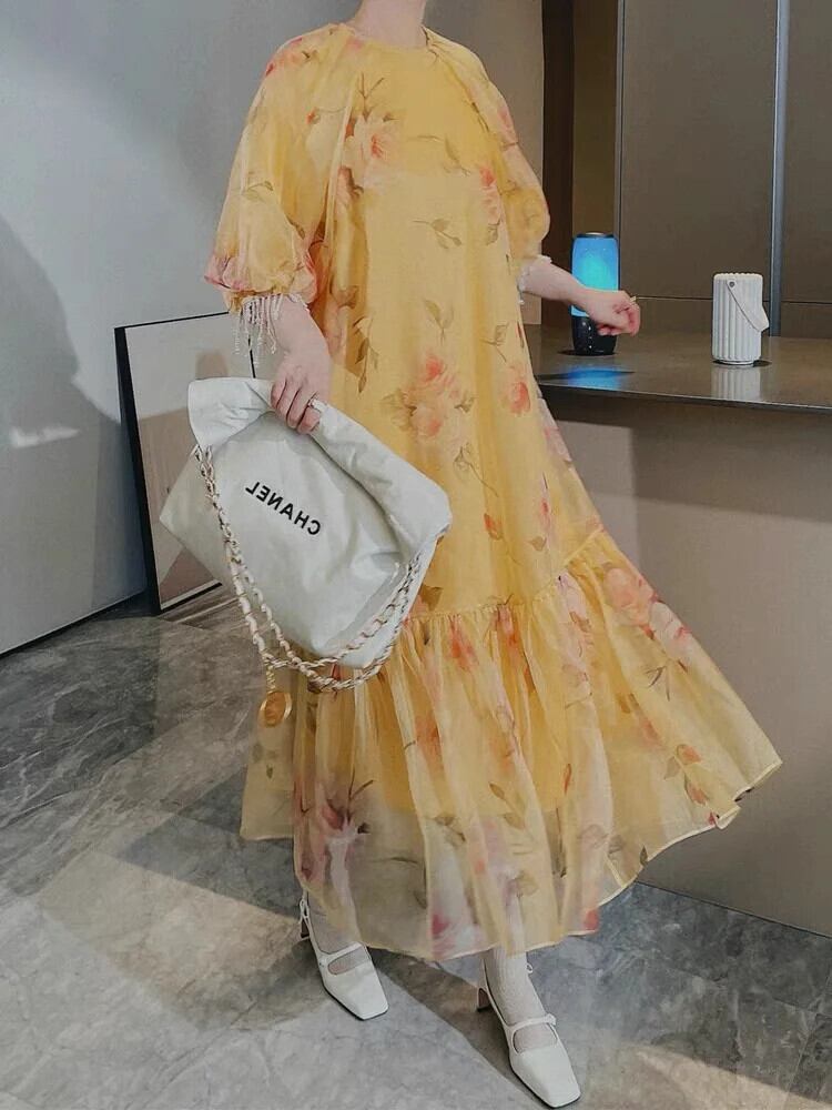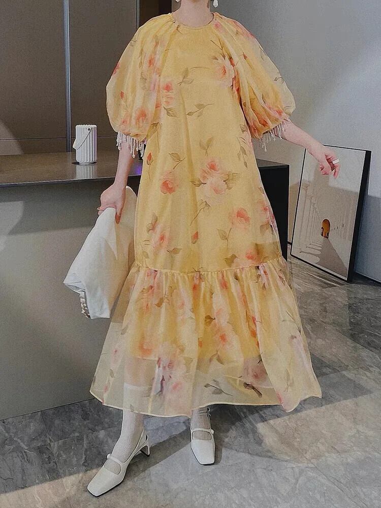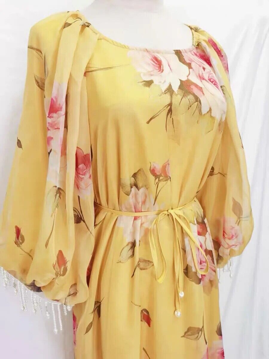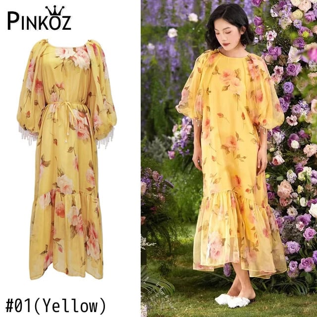 Pinkoz デザイナーイエローナイトドレス花柄ルーズミディパッチワークドレスビーズ電話休日自由奔放生きる o ネックファッションvestidos ローブ ピンク Oネック