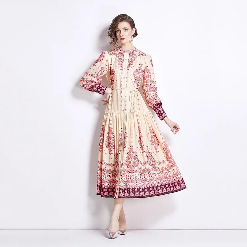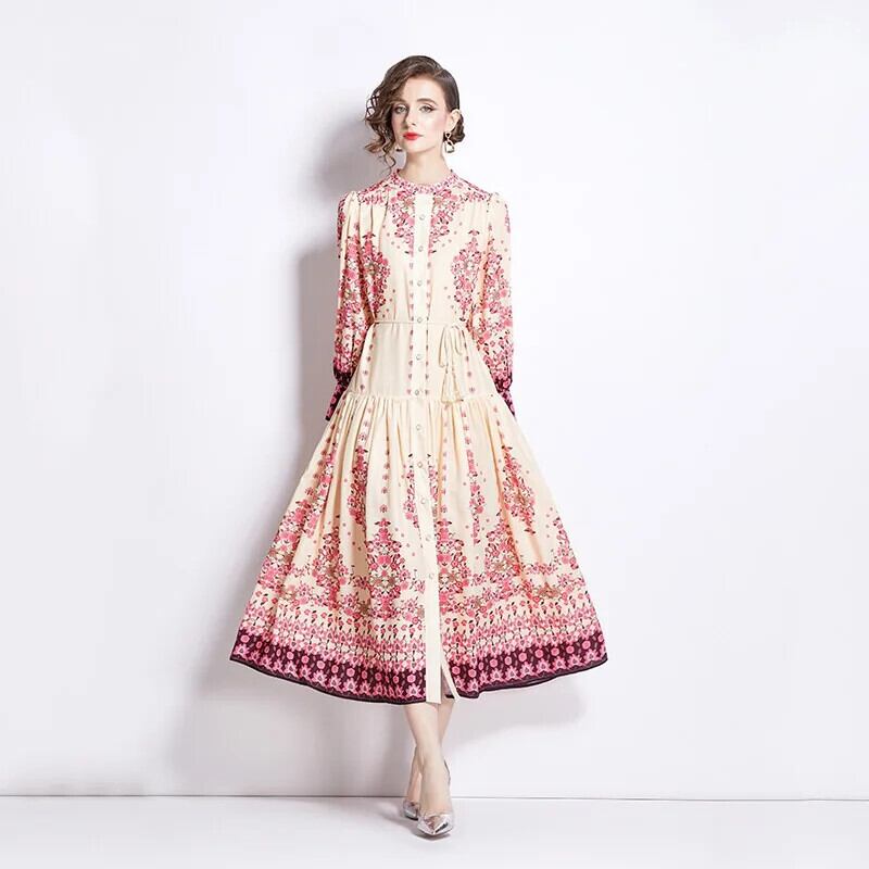 Pinkoz デザイナーシングルブレストスタンドカラー長袖花柄プリントマキシドレスレースアップサッシュvestidosローブ ロング ピンク