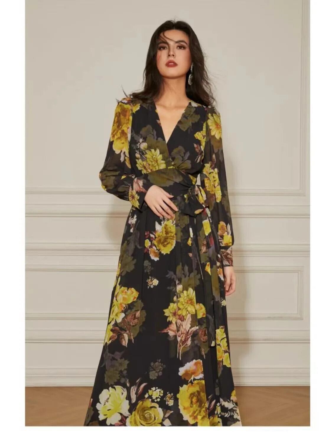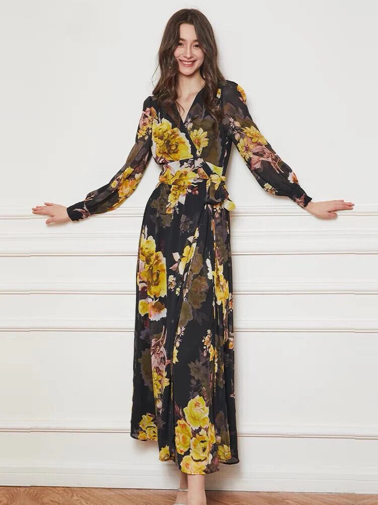 Pinkoz 滑走路デザイナースタイリッシュマキシ花柄プリント v ネックシフォンホリデー春夏ファッション Vestidos ドレスヴィンテージ ピンク スプリング 春物 サマー 夏物 Vネック ビンテージ
