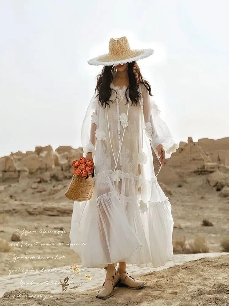 Pinkoz デザイナーフラワーホワイトマキシドレスレースアップ高級ランタンスリーブルーズドレスパーティーナイトvestidos ピンク フラワーデザイン