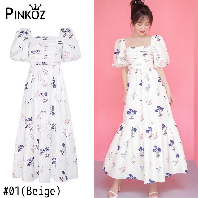 Pinkoz セレブ白花柄スクエアカラーパフスリーブミディ A ラインドレスパーティーナイトオフィスレディサマーローブ ピンク ホワイト 夏物 Aライン スクウェア 会社 学校 通勤や通学にも