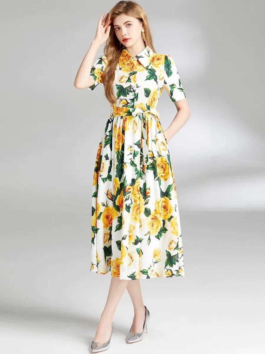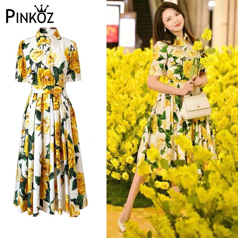 Pinkoz 滑走路デザイナー花柄黄色ターンダウンカラードレスシングルブレストボタンレースアップミディドレスvestidos ピンク