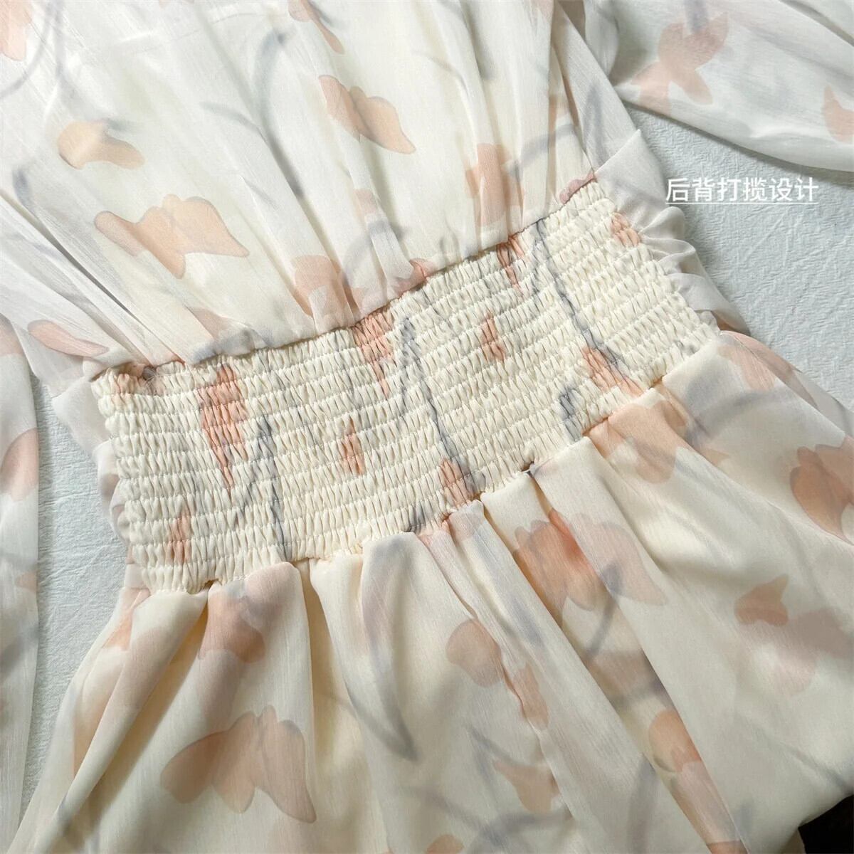 Pinkoz 若いファッション衣類リボンレースアップシフォン A ラインミニショートドレス花柄ウエストゴム Vestidos vinatge ピンク エラスティック 伸縮 Aライン